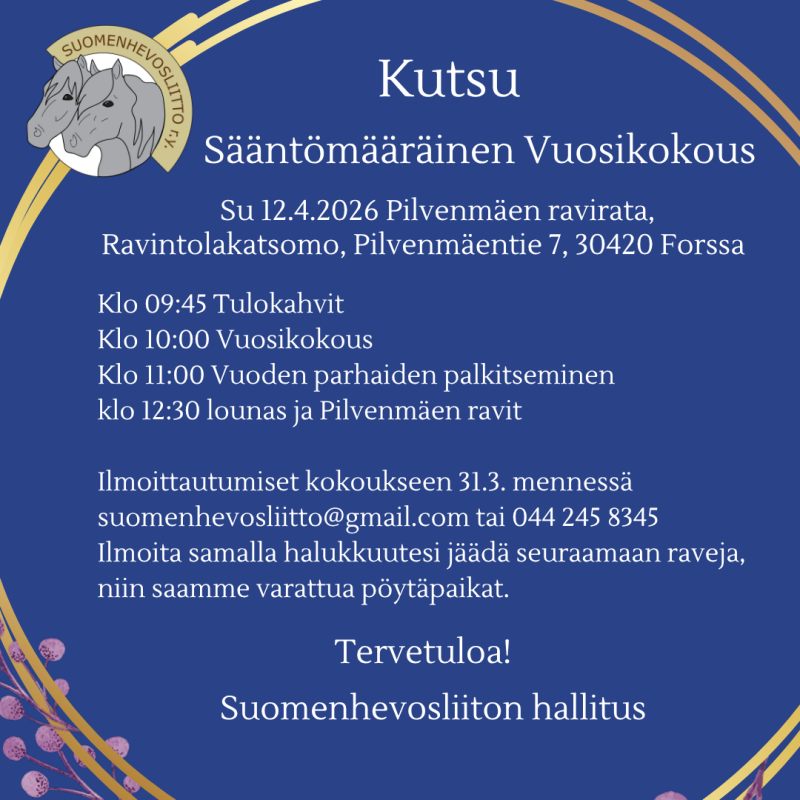 KutsuSääntömääräinen vuosikokousSunnuntaina 12.4.2026 Pilvenmäen ravirata, Ravintolakatsomo, os. Pilvenmäentie 7, 30420 ForssaKlo 09.45 TulokahvitKlo 10.00 VuosikokousKlo